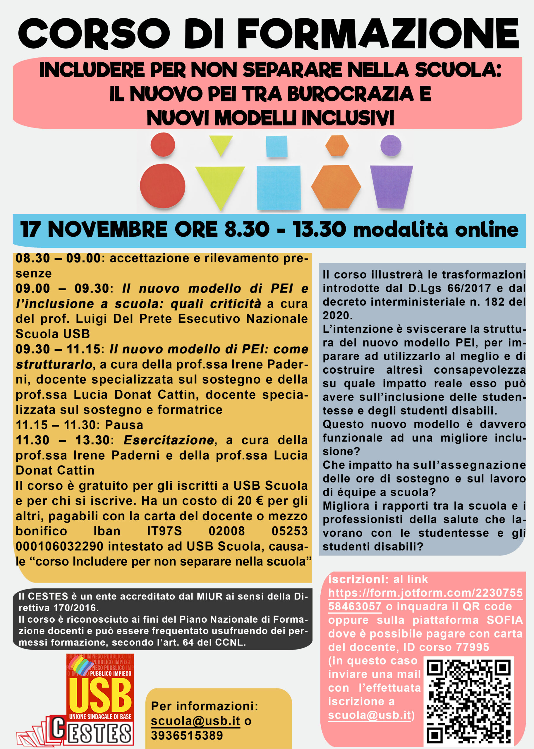 Fwd: USB Scuola e Cestes – Corso di formazione “Includere per non separare nella scuola: il nuovo PEI tra burocrazia e nuovi modelli inclusivi”