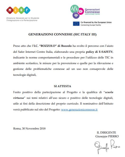 L’I.C. “BOZZOLO” di Bozzolo ha partecipato con esito positivo al progetto promosso da Generazioni Connesse elaborando una propria policy di E-SAFETY, nella quale sono state indicate le norme comportamentali e le procedure per l’utilizzo corretto delle TIC in ambiente scolastico, con attenzione alle misure di prevenzione, rilevazione e gestione delle problematiche connesse all’uso consapevole delle tecnologie digitali, conquistando la qualifica di SCUOLA VIRTUOSA: