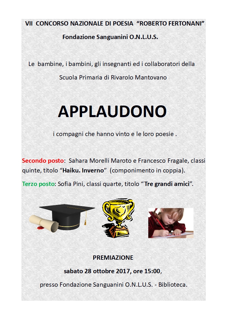 VINCITORI 2° PREMIO CONCORSO DI POESIA “ROBERTO FERTONANI”, FONDAZIONE SANGUANINI O.N.L.U.S., RIVAROLO MN, OTTOBRE 2017